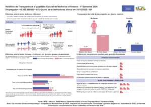 De acordo com o relatório publicado, o salário contratual mediano das mulheres equivale a 93,8% do recebido pelos homens, enquanto a remuneração média mensal das mulheres equivale a 80,6% da recebida pelos homens. O relatório considera dados do eSocial, RAIS Mensal e Portal Emprega Brasil, com base em vínculos ativos em dezembro de 2025 e remunerações apuradas no período de janeiro a dezembro de 2025.